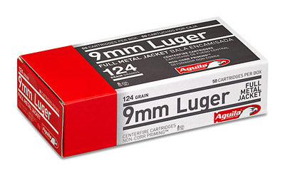9mm - Aguila Ammo FMJAguila Ammunition Pistol 9MM 124 Grain Full Metal Jacket 50 Round Box 1E092110 | 124gr | n/a | 50 | $13.57 | $0.27 | FoundryOutdoors |